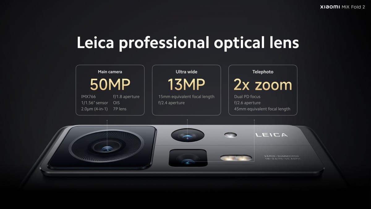 Mix Fold 2 هو الهاتف الثاني الذي يستفيد من شراكة شاومي مع شركة Leica ويحصل على مستشعر رئيسي Sony IMX766 بدقة 50 ميجابكسل مع خاصية التثبيت البصري. مثل شاومي 12S Ultra، حصل Mix Fold 2 على أنماط تصوير Leica Authentic و Vibrant بالإضافة إلى عدد قليل من فلاتر Leica. يحتوي الجزء الخلفي أيضًا على كاميرا زاوية عريضة بدقة 13 ميجابكسل وكاميرا مقربة بدقة 8 ميجابكسل مع تقريب بصري 2x.
