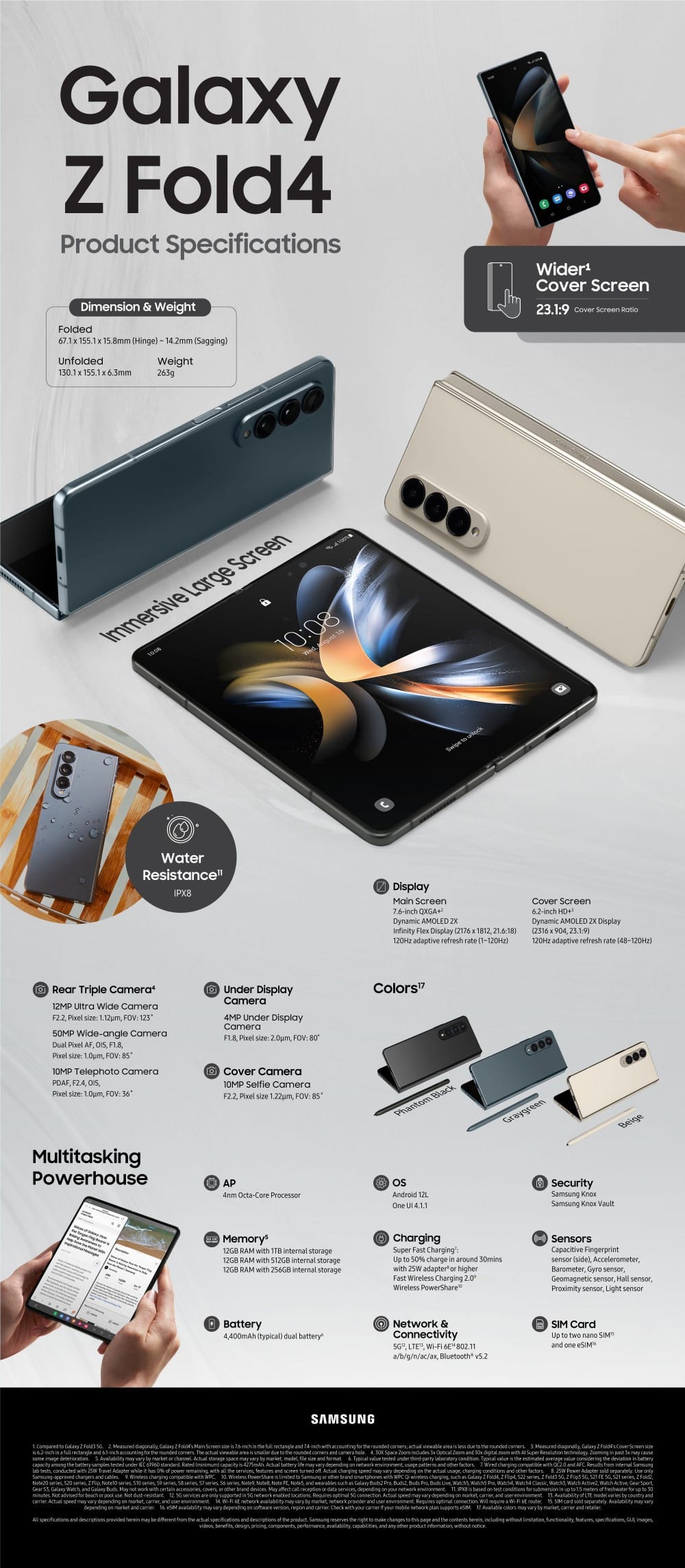 يأتي Z Fold4 بحجم أصغر قليلاً من الاصدار السابق بفضل الحواف الرقيقة وتغير نسبة العرض إلى الارتفاع لكلتا الشاشتين لتكون أكثر راحة عند الاستخدام. الشاشة الخارجية مقاس 6.2 بوصة، وبدقة 2316 × 904، لذا فهي طويلة ونحيفة. الشاشة الداخلية أكبر بكثير بحجم 7.6 بوصة، وتوضح دقة 2176 × 1812 أنها مربعة الشكل.