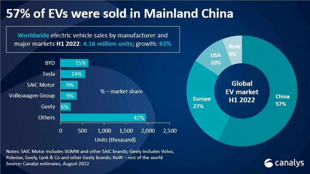 وفقًا لأحدث الأبحاث من Canalys، واصل سوق السيارات الكهربائية العالمي نموه السريع في النصف الأول من 2022. على أساس سنوي، ازداد حجم مبيعات السوق العالمي بنسبة 63٪ والشيء المثير للاهتمام هنا أن المبيعات الصينية تمثل 57٪ من إجمالي الحجم العالمي.