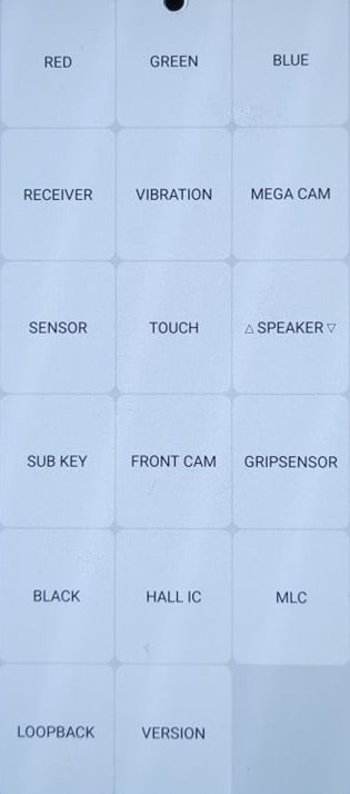 يقوم “VIBRATION” باختبار محرك الاهتزاز في الهاتف. ستتحول الشاشة الي اللون الأسود بمجرد الضغط على زر “VIBRATION”، مصحوبًا باهتزاز مستمر. اضغط على الشاشة مرة واحدة للخروج من هذا الاختبار والعودة إلى شاشة الاختبار الرئيسية.