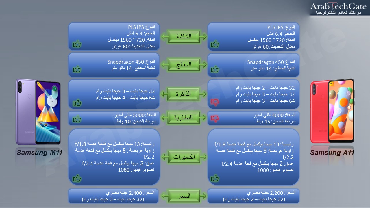 بإجراء مقارنة سريعة بين سامسونج A11 وهاتف آخر مقارب في نفس الفئة السعرية مثل هاتف سامسونج M11، وجدنا الآتي: