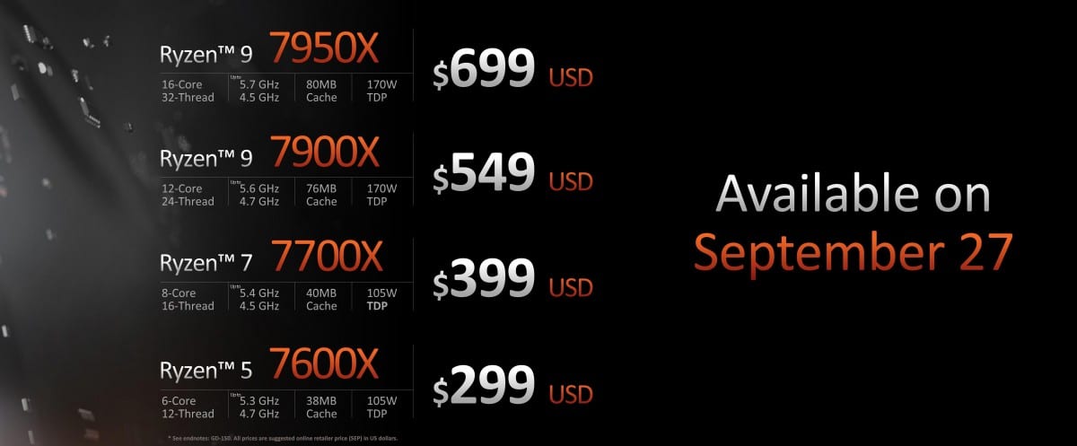 يأتي في المقدمة Ryzen 9 7950X، وهو معالج 16 نواة و 32 مسار قادر على الوصول الى تردد 5.7 جيجاهرتز مع تردد أساسي 4.2 جيجاهرتز. يتميز بسعة ذاكرة تخزين مؤقت إجمالية تبلغ 80 ميجابايت. يبلغ سعره 699 دولارًا، وهو أقل 100 دولار من سعر إطلاق 5950X.