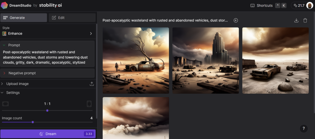 نظرًا لأن الكود هو مصدر عام، فيمكنك استخدامه بسهولة بطرق مختلفة لإنشاء صور ومقاطع فيديو وعروض ثلاثية الأبعاد ورسوم متحركة واقعية. يمكنك البدء بأدوات سهلة الاستخدام للمبتدئين، Clipdrop و DreamStudio. تستخدم كلتا المنصتين نماذج Stable Diffusion التوليدية وتختلفان فقط في عناصر التحكم التي توفرها لك.