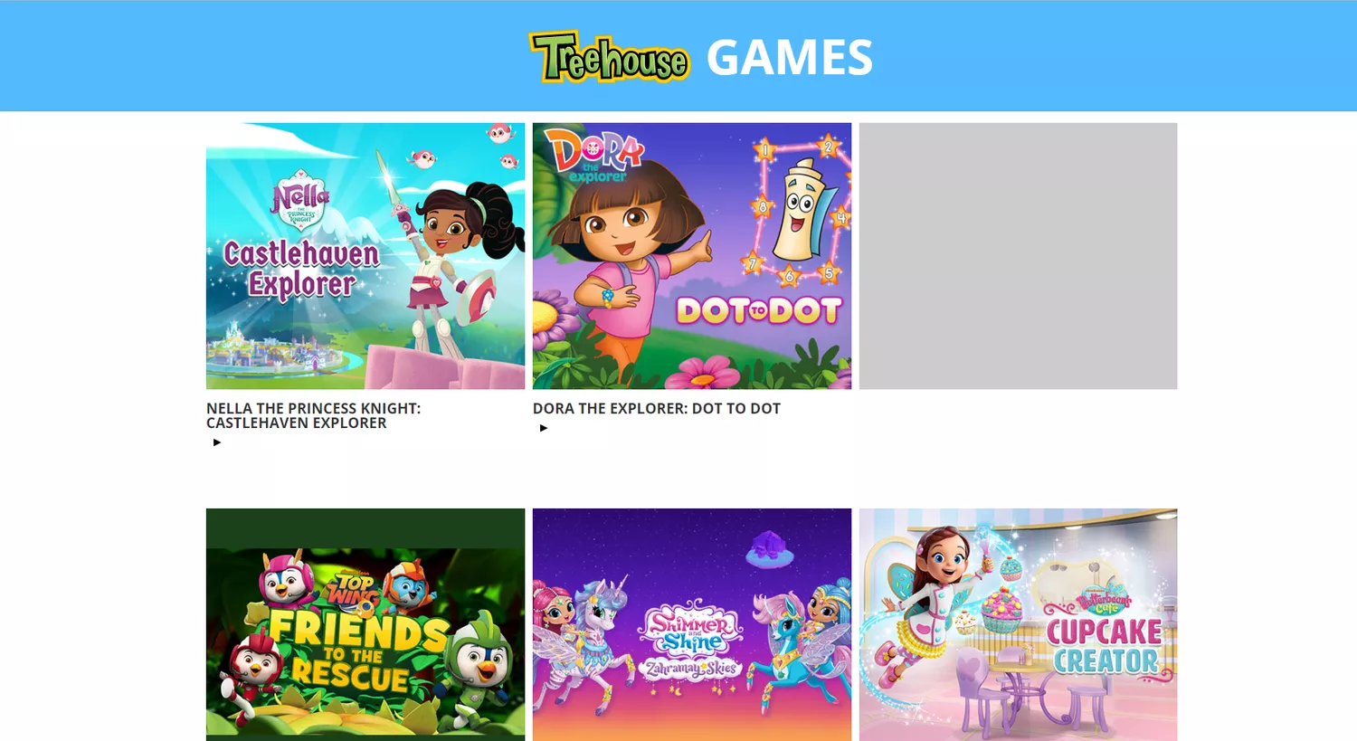 يقدم موقع Treehouse بعض الألعاب الممتعة والمجانية للأطفال في سن ما قبل المدرسة عبر الإنترنت، والتي تتميز بجميع أنواع شخصيات الأطفال التلفزيونية. توجد هنا ألعاب تعليمية وترفيهية كافية تحتوي على العديد من الشخصيات مثل شخصيات من Blaze ، Paw Patrol ، Bubble Guppies ، Ricky Zoom ، Blues Clues ، وغيرها.