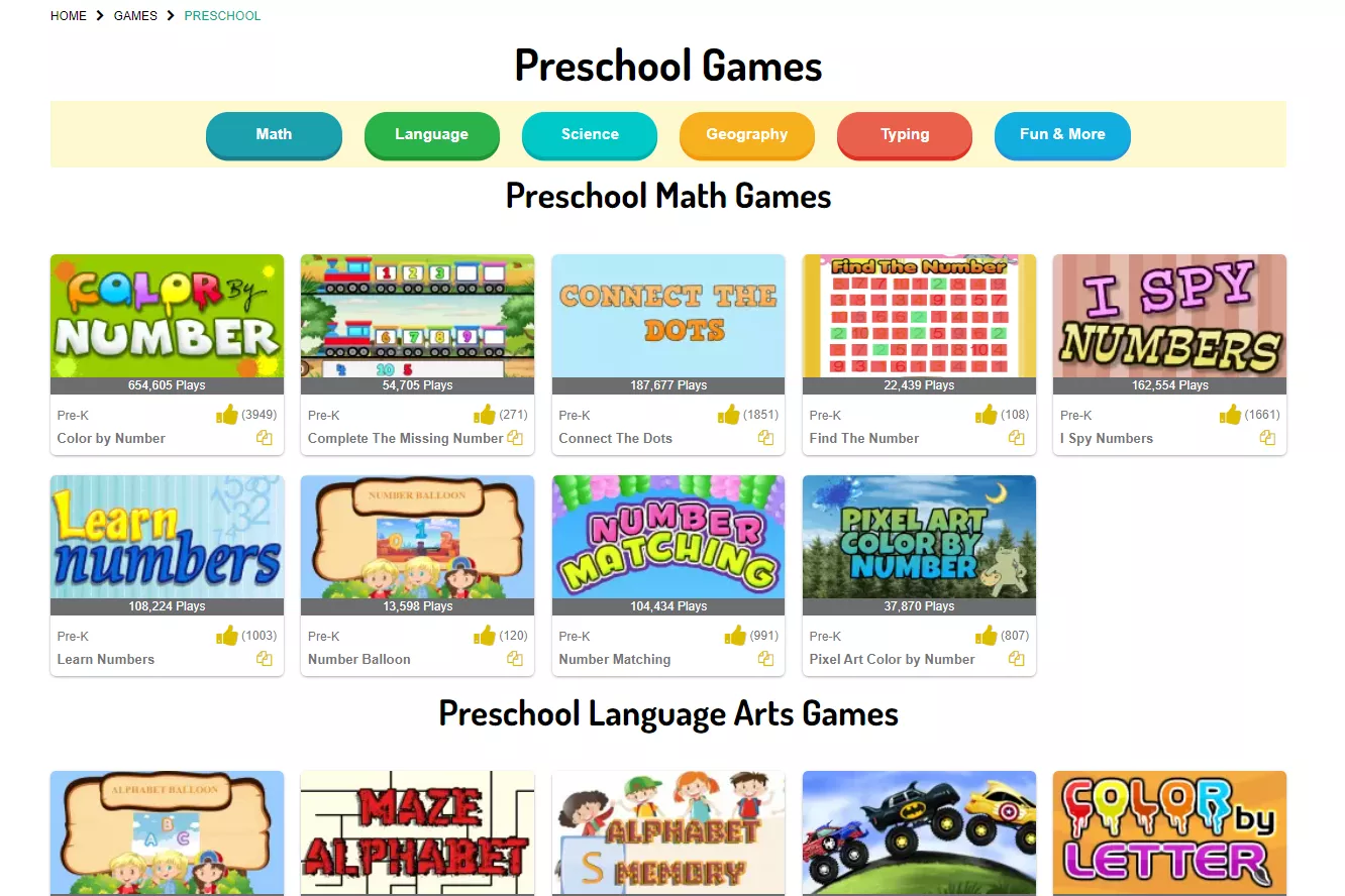 يحتوي موقع Turtle Diary على العشرات من الألعاب لمرحلة ما قبل المدرسة المقسمة إلى فئات مثل الرياضيات واللغة والكتابة والعلوم والمزيد، لذا من السهل العثور على شيء للعب. تتضمن هذه الألعاب احصائيات عن الألعاب الأكثر استخداماً والحائزة على تقييمات ايجابية. هذه طريقة جيدة لتجنب لعب لعبة قد لا تكون ممتعة أو تعليمية مثل لعبة أخرى.