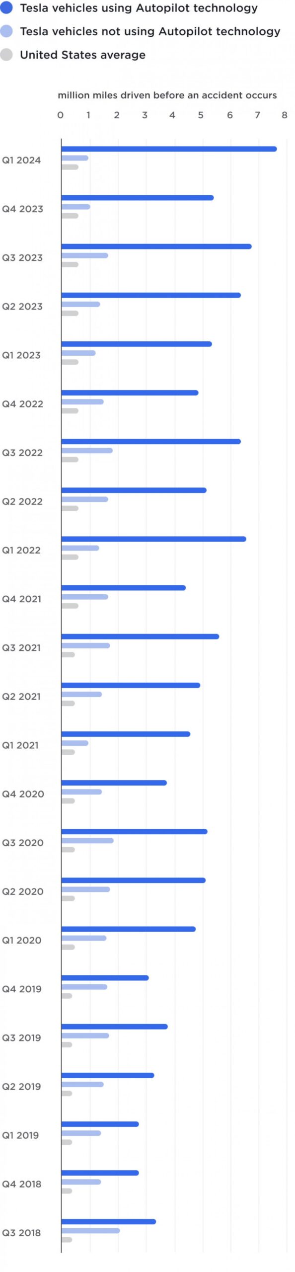 وفقًا للتقرير، قطعت سيارات تسلا المجهزة بتقنية القيادة الذاتية مسافة 12.2 مليون كيلومتر في المتوسط قبل التعرض لحادث. ويعد هذا تحسنًا مذهلاً بنسبة 47% مقارنة بالفترة نفسها من العام الماضي، وشهادة على القدرات المتطورة لتقنية القيادة الذاتية من تسلا. وللمقارنة، تبلغ هذه المسافة في المتوسط الوطني الأمريكي لجميع السيارات ما يزيد قليلاً عن مليون كيلومتر لكل حادث.